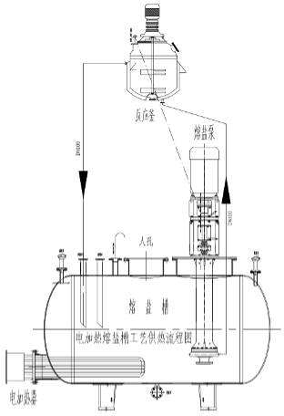 正常生產(chǎn)中,熔鹽介質(zhì)經(jīng)熔鹽槽內(nèi)的電加熱器,加熱到一定的溫度后由熔鹽泵輸送給熔鹽換熱器,將熱量傳給熔鹽換熱器內(nèi)的物料,放熱降溫后自流回熔鹽槽,熔鹽槽內(nèi)的電加熱器不斷的對(duì)熔鹽介質(zhì)加熱,再經(jīng)過(guò)熔鹽循環(huán)泵強(qiáng)制液相循環(huán)將熔鹽介質(zhì)的溫度傳送給熔鹽換熱器內(nèi)的物料,周而復(fù)始循環(huán),熔鹽槽內(nèi)的電加熱器不斷的在加熱,熔鹽泵不停的工作,被加熱的熔鹽介質(zhì)不斷的循環(huán)流動(dòng),熔鹽換熱器內(nèi)的物料不停的吸收熱量,直到熔鹽換熱器內(nèi)的物料達(dá)到工藝溫度后,再停熔鹽泵,熔鹽介質(zhì)通過(guò)熔鹽的自重回到熔鹽槽中。
